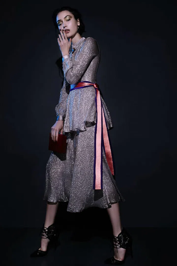 Maybe you’re not the kind of person who likes to go all shiny just because it’s the festive season; instead opt for an outfit in a strong graphic or print like this look in black and white. Adding a colourful bag and pair of boots makes your look more ‘fun’ than office. Saida is wearing Wool off-shoulder top, $1,870, Alexander McQueen and Wool-blend printed skirt, $1,485 Alexander McQueen; with Tablecloth Cross Body Insignia Bag, $1,680 Alexander McQueen; Embellished collar, $340, Bimba Y Lola; and Orange Digital Gate Ankle Boots, $2,640, Louis Vuitton.