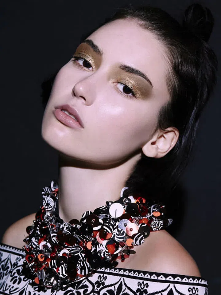 We wanted to have a bit of fun with our festive looks for this shoot, so we tried the hot ‘gold’ makeup trend on our model Saida. Our superstar makeup artist and hairstylist Sha Shamsi used Mac Cosmetics to get this great full-shine look. What do you think? Going to give it a try for your next party look? Saida is wearing an Embellished collar, $340, Bimba Y Lola; and a Wool off-shoulder top, $1,870, Alexander McQueen.