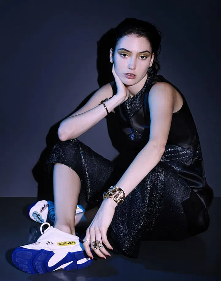 We love mixing up a rather elegant evening gown with a pair of sneakers, don’t you? It’s the easiest way to make sure you don’t ever look too overdressed. Saida is wearing Holloway Gown, $1,650, Tory Burch; Nile cuff in Yellow Gold finish with crystals (on left hand), $980, Atelier Swarovski; Peter Pilotto 'Arbol' cuff in Gold Finish with crystals (on right hand), $760, Atelier Swarovski; Ye Mingzi 'Elements of the Universe' rings in Rose Gold and Rhodium Finish with crystals, $250/each Atelier Swarvoski; Nile Ring in Yellow Gold finish with crystals (on left hand), $375, Atelier Swarovski; and Fusion White Sneakers with Embroidery, $1,850, Christian Dior.