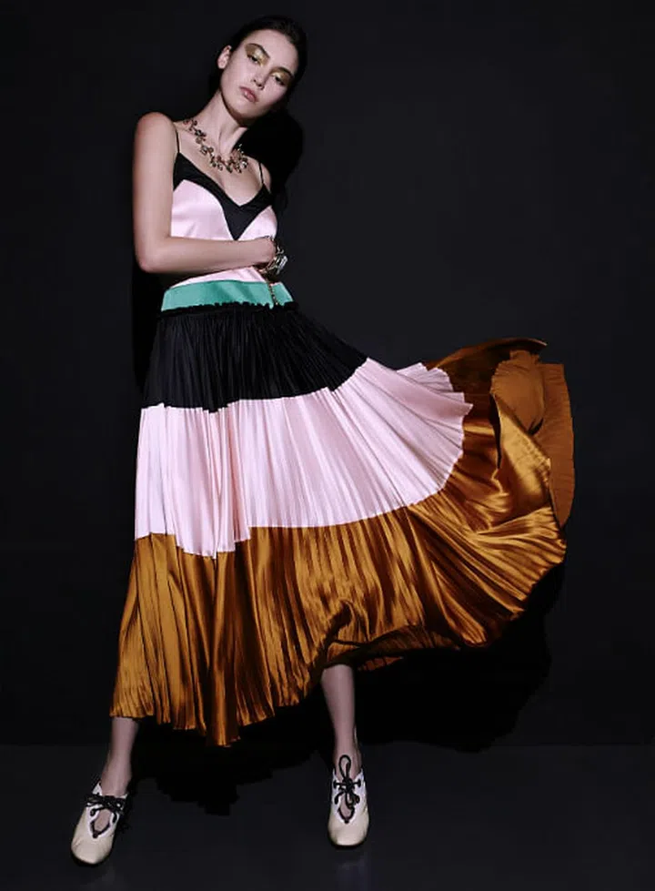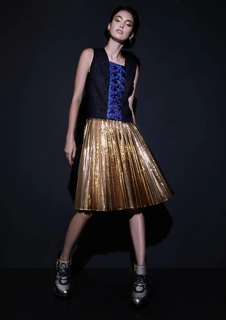 We all know that a super shiny pleated skirt is totally on-trend - and in everyone’s wardrobe - right now. B mixing it up with a strongly coloured - but matte - top means you can wear this look to just about any sort of festive event. Saida wears Phoenicia Embellished Guipere Lace Top, GBP288.33 by Peter Pilotto from theoutnet.com; Pleated Skirt, GBP176 by DKNY from theoutnet.com; and White Digital Gate Ankle Boots, $2,640, Louis Vuitton.