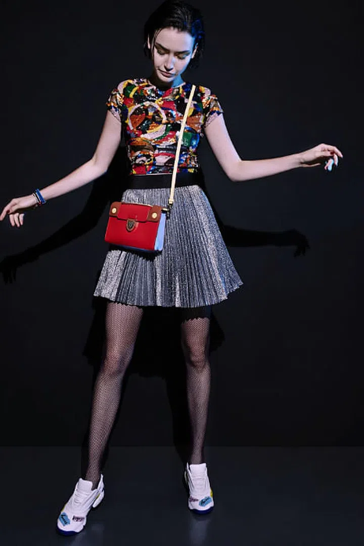 If you’ve got a great pair of legs then you need to show them off, right? This is another way of mixing up a bit of bling with some fun colour for a go-anywhere party look. Add a sling bag and wear with sneakers so you can party all night long. Saida is wearing Danica Sunburst Pleated Mini Skirt, alice + olivia, and Kelli Crop Top, alice + olivia; Fusion White Sneakers with Embroidery, $1,850, Christian Dior; Diorever Squad Bag, $3,300, Christian Dior; Calf Leather Bracelets, $260 each, Prada.
