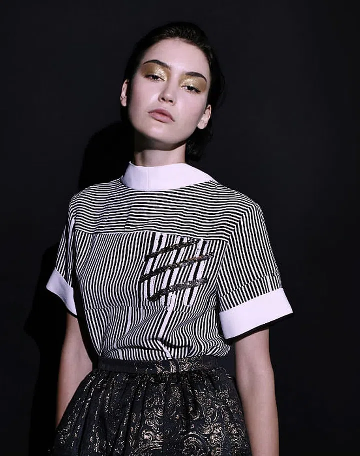 Another way to make sure you’re not too OTT festive with your party look is to mix up a super shiny piece with a more tonal piece or something in black and white like in this look. Saida is wearing a Cotton-blend stripe top, Carven; and a Polyester-blend brocade skirt, Kenzo.