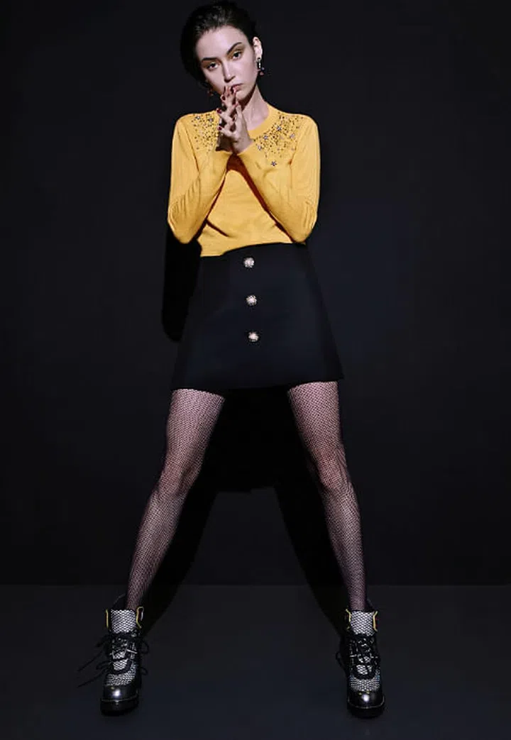 You can easily dress up pieces you’ve already got in your wardrobe - like this cute button-up skirt - by adding a top with a bit of bling combined with a funky pair of boots; we also used a pair of fishnet stockings to really dress up the look (thanks Ong Jollin!). Saida is wearing Cashmere embellished pullover, Miu Miu; Viscose button skirt, Miu Miu; Orange Digital Gate Ankle Boots, $2,640, Louis Vuitton; Peter Pilotto 'Arbol" pierced earrings in Rhodium Finish with crystals, $510, Atelier Swarovski.