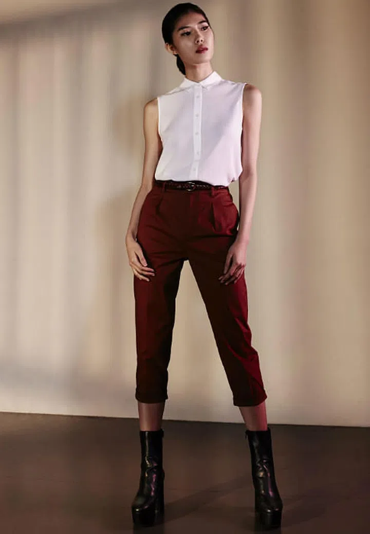 Yep, you can go ‘tailored’ and still be on trend. Sohee is wearing Uniqlo Rayon Sleeveless Blouse, $39.90, Cotton Wide Leg Tapered Ankle Length Pants, $49.90, and Mesh Belt, $39.90. A super easy way to make this outfit perfect for cooler weather is to add a Heattech Long-Sleeve T-Shirt, $19.90, underneath your shirt. Shop the t-shirt at www.uniqlo.com/sg/women-heattech-scoop-neck-t-shirt. Uniqlo’s Heattech pieces are available in three different ‘warmths’ ie. Heattech, Heattech Extra Warm and Heattech Ultra Warm - the warmest of the three types.