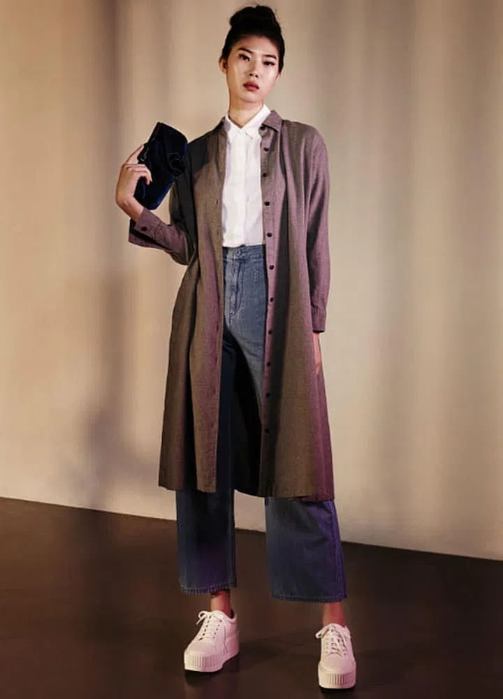 We love the on-trend look of these wide-leg denim trousers plus the long ‘coat’. Sohee is wearing Uniqlo Flannel Shirt Dress, $59.90 (worn as a coat), Uniqlo Rayon Short Sleeve Blouse, $39.90, and Flare Jeans, $39.90.