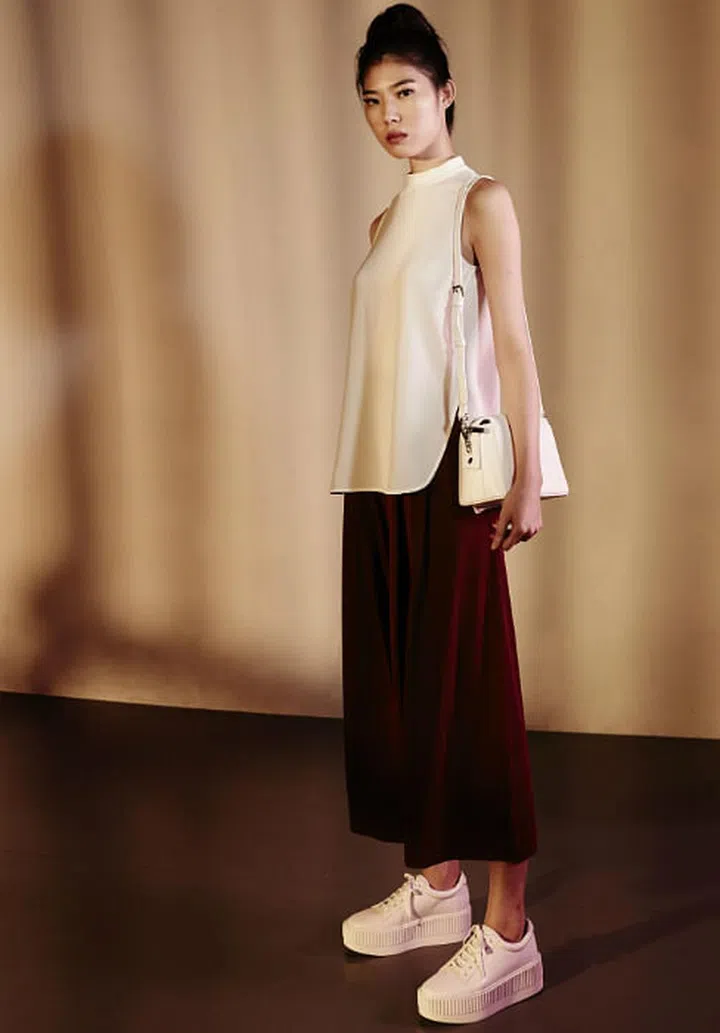 When wearing the oversized trend, it’s important to show a bit of skin as a comparison - make sure your pants show a good bit of ankle, or your top is sleeveless. Sohee is wearing Uniqlo High Neck Sleeveless Blouse, $39.90, and Uniqlo Wide Leg Pants, $49.90.
