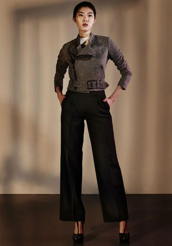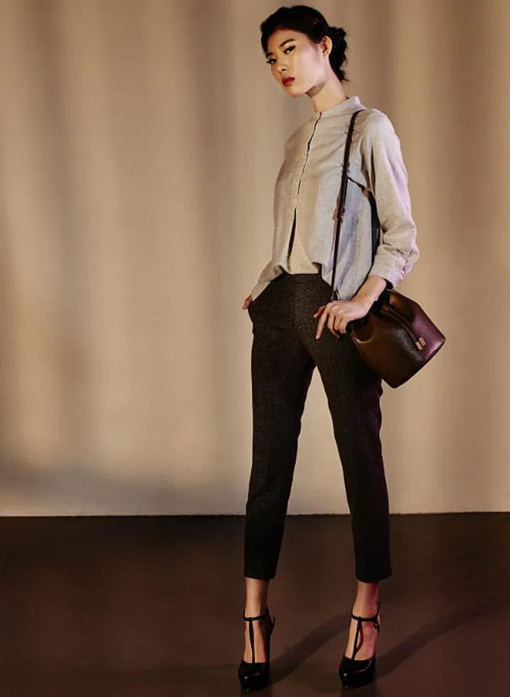 Sohee is wearing Uniqlo Flannel Stand Collar Shirt, $39.90, and Uniqlo Tweed Ankle Length Pants, $59.90.