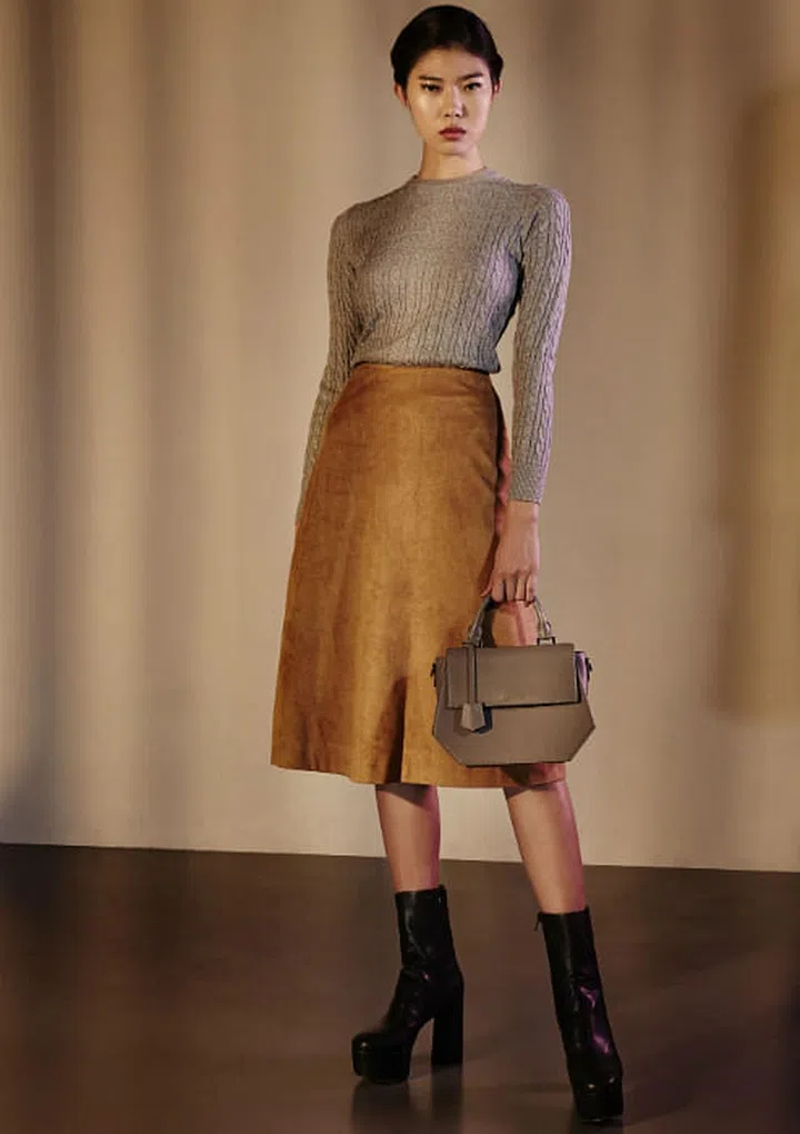 Sohee is wearing Uniqlo Cotton Cashmere Cable Sweater, $39.90, and Uniqlo High Waist Faux Suede Flare Skirt, $39.90.