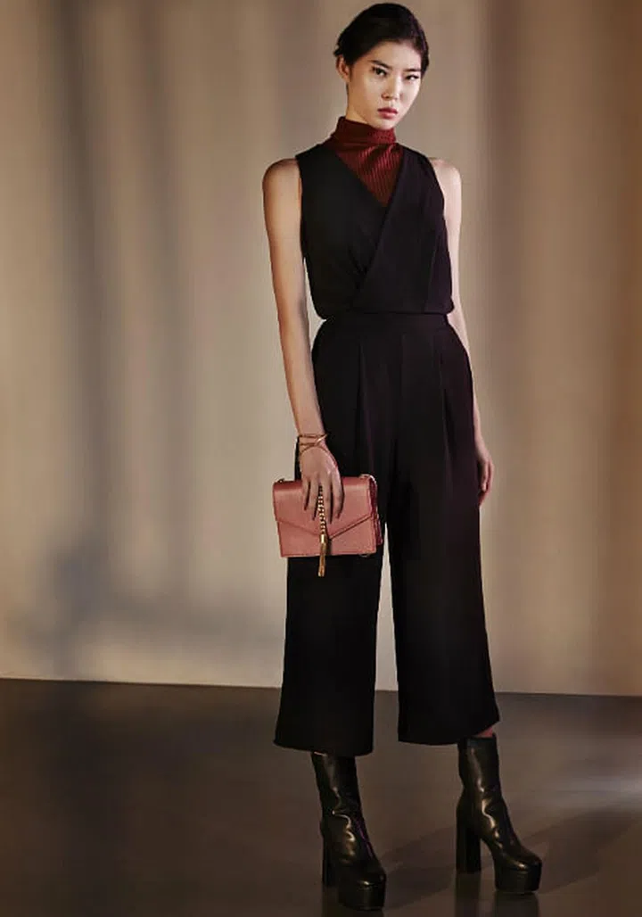 Sohee is wearing Uniqlo Merino Blend Ribbed Turtleneck Sweater, $39.90, and Uniqlo Cache Coeur Jumpsuit, $49.90.
