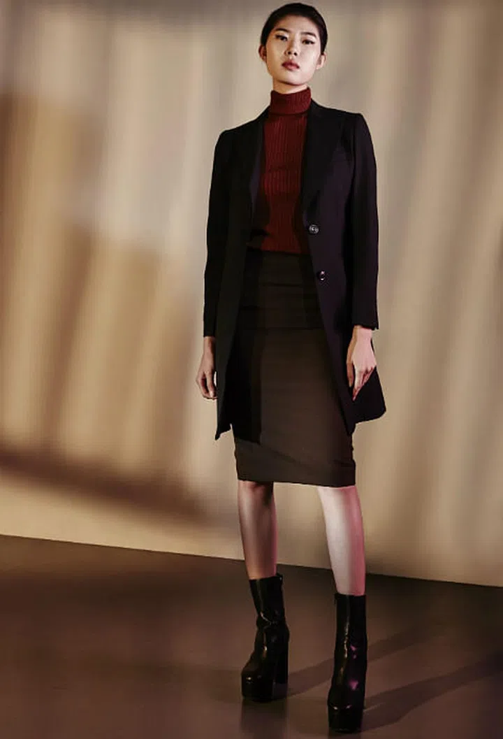 These dark, muted but strong colours totally make the classic shapes look modern and very ‘now’. Sohee is wearing Uniqlo x Carine Roitfeld wool stripe long coat, $199.90, Uniqlo Merino Blend Ribbed Turtleneck Sleeveless Sweater, $39.90, and Carine Roitfeld pencil skirt, $59.90. The Uniqlo x Carine Roitfeld FW16 Collection is now available at Uniqlo Orchard Central and online at www.uniqlo.com/sg/carine-roitfeld.