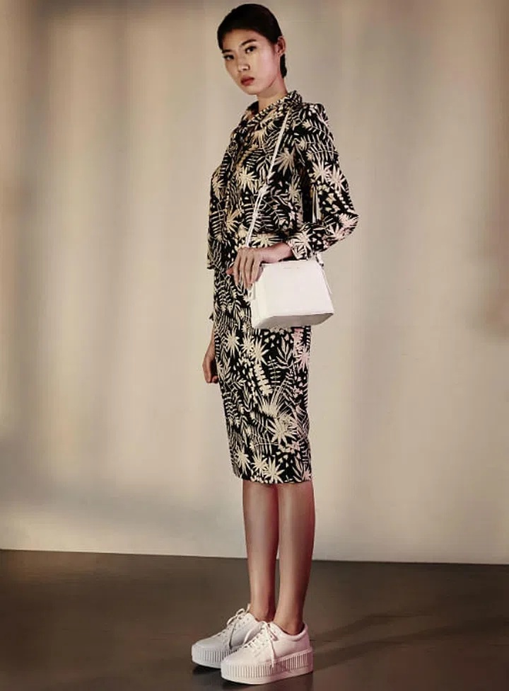 Yep, we’re still loving print-on-print but you need to toughen it up with a pair of cool sneakers. Sohee is wearing Uniqlo x Carine Roitfeld silk bow tie print long sleeve blouse, $99.90, and Carine Roitfeld synthetic print tight skirt, $59.90. The Uniqlo x Carine Roitfeld FW16 Collection is now available at Uniqlo Orchard Central and online at www.uniqlo.com/sg/carine-roitfeld.