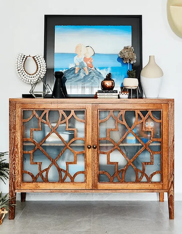 Lots of natural materials were used in this home, including wood furniture and accessories made of shells and clay. The artwork on display is by Chinese contemporary artist Wu Qiong.