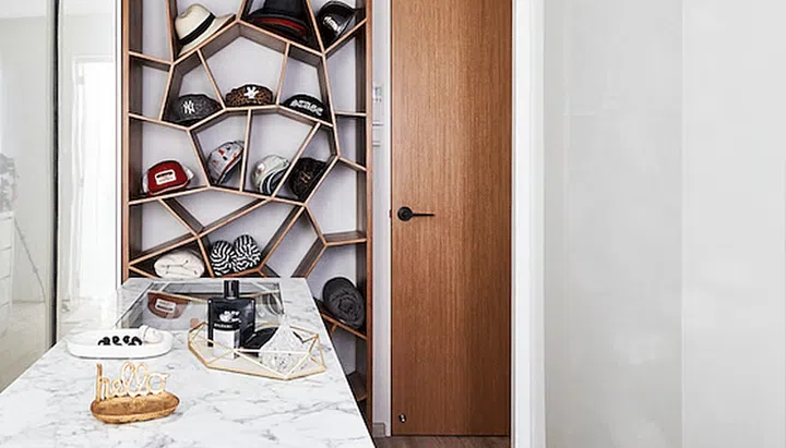 “I needed lots of storage space for my collection of caps, watches and clothing. Ivan decided to transform one of the bedrooms into a complete wardrobe space with sliding doors to keep the space looking clutter-free. He built an island feature in the room, where I showcase some of my favourite pieces. I like that it now looks like a “boutique”, and I have a dedicated space for dressing up.”
