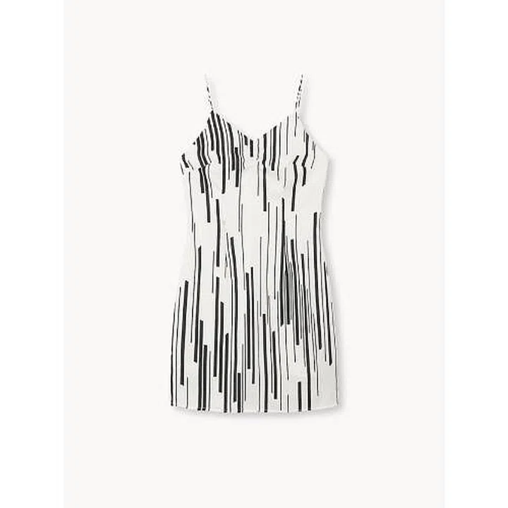 This abstract printed dress contrasts well-placed black stripes against a cream negative space to create an illusion of a shapely hourglass silhouette, making it a perfect option for those with apple and rectangle shaped bodies.