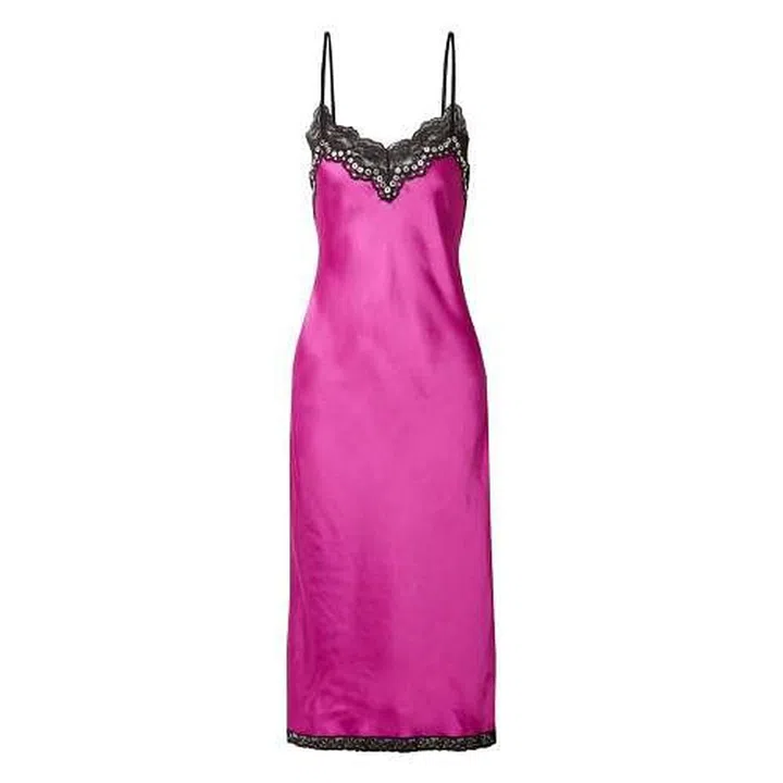 This slinky magenta number is both sexy and feminine, thanks to the addition of lace trimmings that adds dimension while bringing attention to the v-cut neckline.