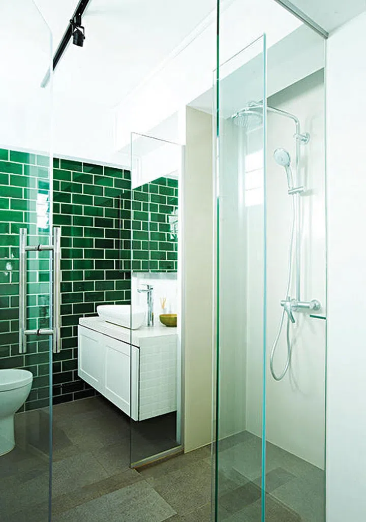 The interior designer refurbished the toilet and turned it into an elegant en suite bathroom. A shot of emerald green in the bathroom works just to liven things up.