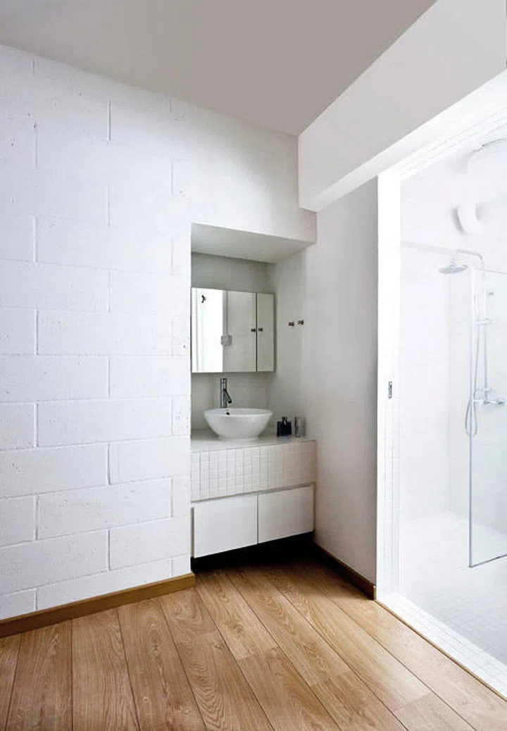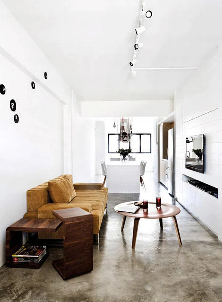 The unevenly-toned cement screed floor gives an edgy and raw vibe to the minimalist space.