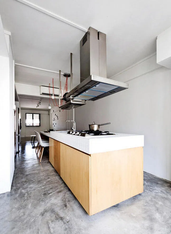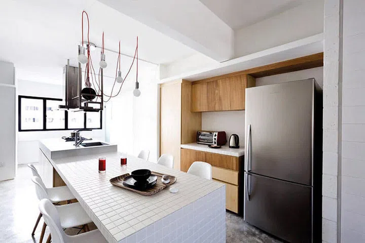 This three-room HDB flat at Shunfu was reconfigured by BOX ID Studio to produce more that made the home look . The new layout allowed the homeowners to fit a long kitchen island worktop cum dining table, and even a walk-in wardrobe.