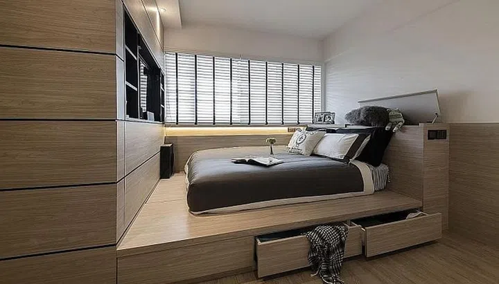 Interior designers suggest incorporating built-in storage. For example, having floor-to-ceiling shelves to maximise wall space, or opting for beds with storage beneath them.