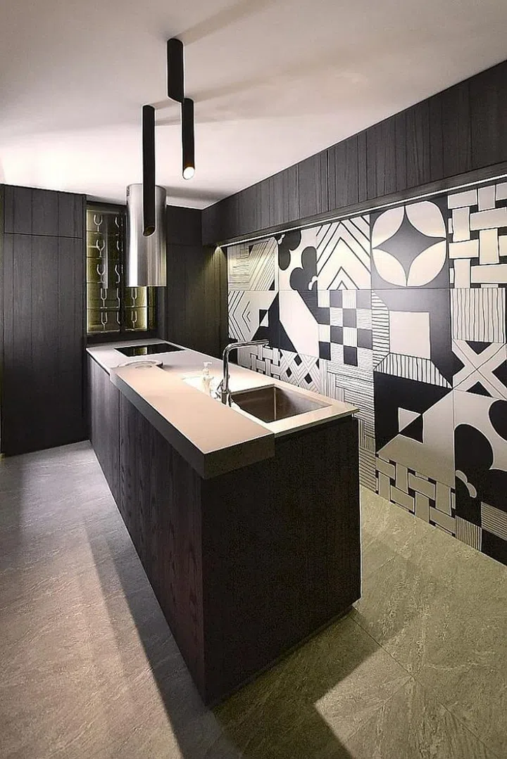 This look, Ms Yip says, works for homes with lots of light coming through. But, she warns, interiors like this may mean more cleaning, as dust shows easily on dark surfaces. They also used hand-drawn Italian tiles with busy patterns to create a feature wall in the kitchen.