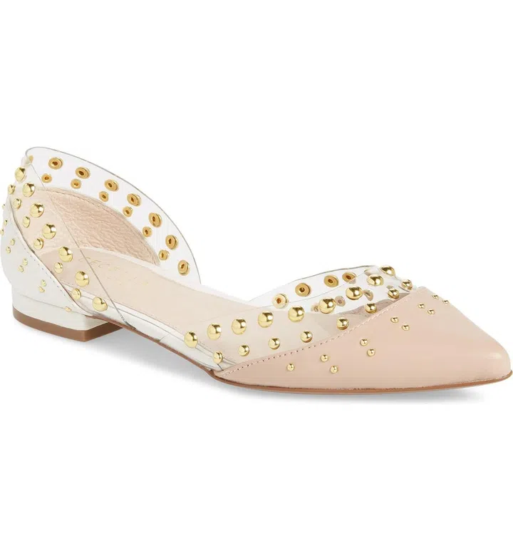 The classic d'orsay silhouette gets a contemporary update with metallic studs and clear PVC uppers for the edgy bride.