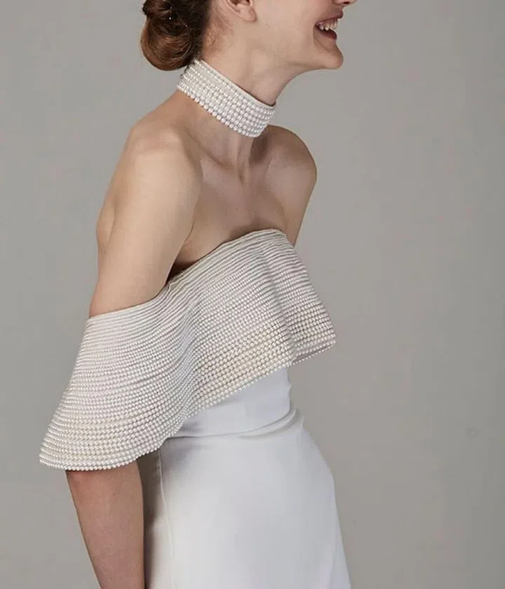 Love the look of luxe minimalism? You'll adore this sleek piece with a peplum cloaked in rows of lustrous pearls. A matching choker completes the look. Alternatively, rock statement earrings.
