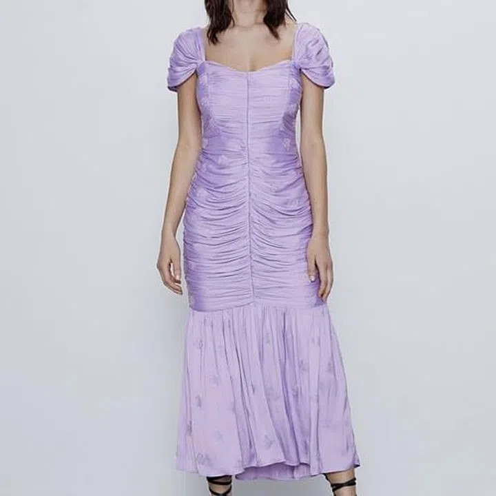 Straight out from a fairytale, statement sleeves oozing of romantic, princess-like vibes stepped out from the storybooks and right onto the runways of SS ‘20. Romantic shapes like the puff sleeve were especially prominent. This ruched lavender dress features little floral embroidery and a ruched sleeve that softly drapes off the shoulder. We think this will look pretty next to a pair of polka dotted ballet flats that will really bring out its sweet femininity.