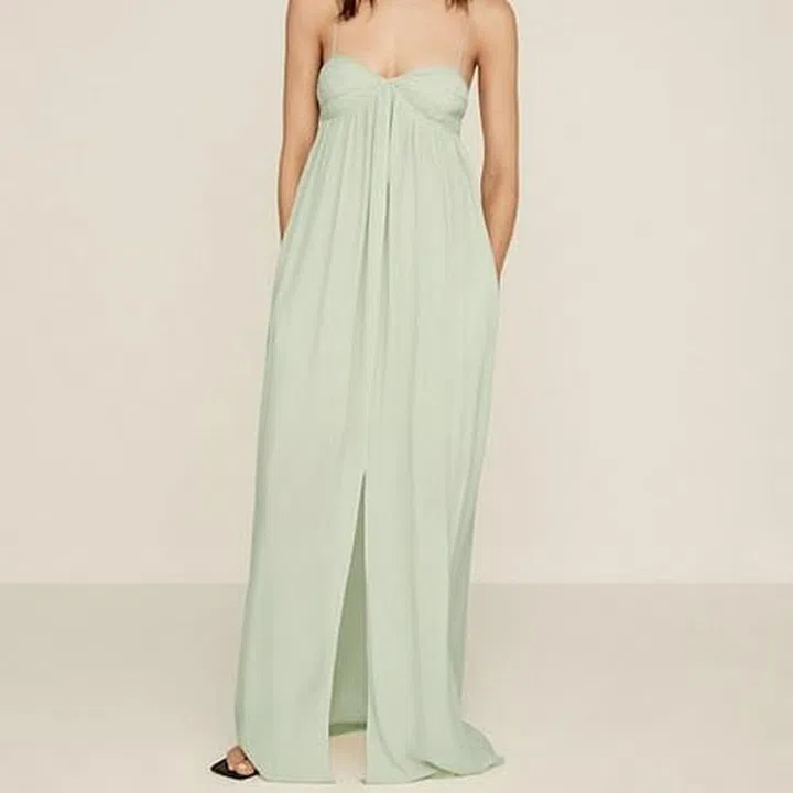 Anchored by sophisticated silhouettes such as relaxed tailored suits and contemporary voluminous dresses, these sugary Paddle Pop colours have proven to play nice amongst grown-ups as well. This mint green dress features a long trail of flowy fabric held up by extra thin straps. The bustier cups are also detailed by pleats – a nice touch to finish this breathtaking number.