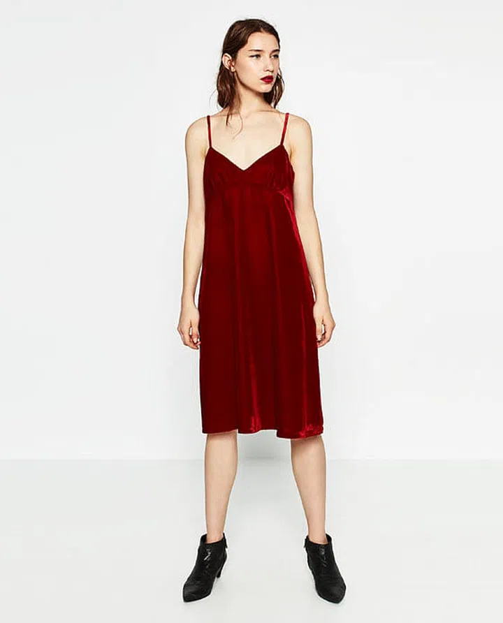Velvet has been on our radar for quite some time now, and we’re not giving up on the trend yet. For a less revealing look, opt for a long-sleeve t-shirt to go underneath this strappy dress.