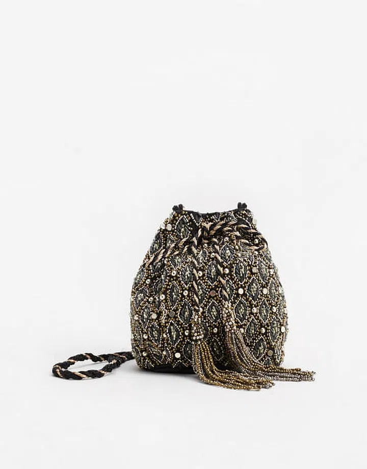 Accented with sparkly beads and golden tassels, this bag exudes a classy bohemian luxe vibe that will pair seamlessly with a billowing maxi dress.