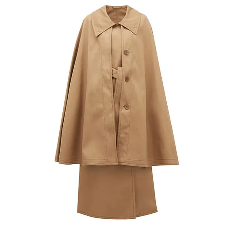 Combining the elements of a classic cape and a trench coat, Lemaire presents this exquisitely elegant number that is cut from twill with sharp oversized lapels. Sleeveless with a voluminous draped cape that trails behind you, this outerwear was tactfully layered over a crisp oversized dirty green long-sleeved shirt, camel-toned culottes that matched the cape, and a pair of ankle-strapped platform pumps during the brand’s Fall 2019 runway show.