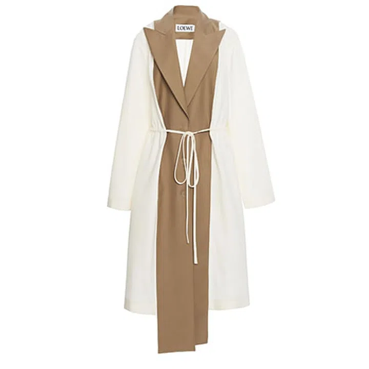 Loewe’s relaxed trench coat looks particularly fresh and appealing for spring – this could be due to the two-toned white-and-beige design and the matching white drawstrings used to elegantly cinch the waist. A more casual approach to the trench coat, this wool coat still manages to look polished with its structured lapels and asymmetrical hemline. Wear this as a shirtdress and style it with a pair of your comfiest sneakers.