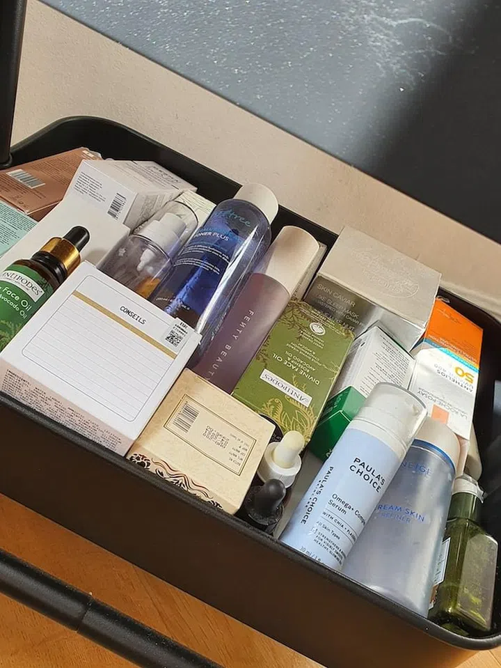 I keep all my skincare in easy-to-open boxes so no dust or dirt gets stuck on them and I wipe down the boxes and skincare bottles every week to ensure all the residue from my hands doesn’t attract any other dirt and germs.