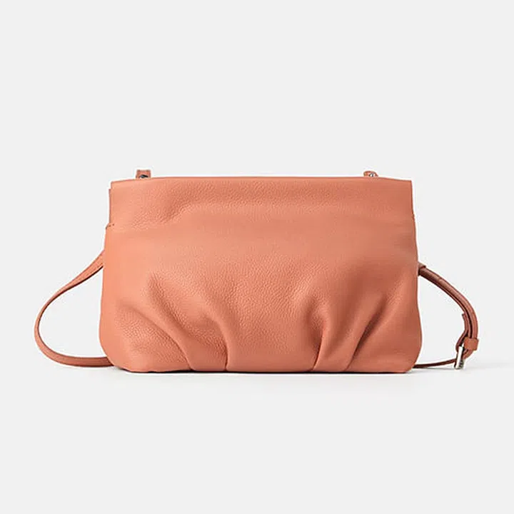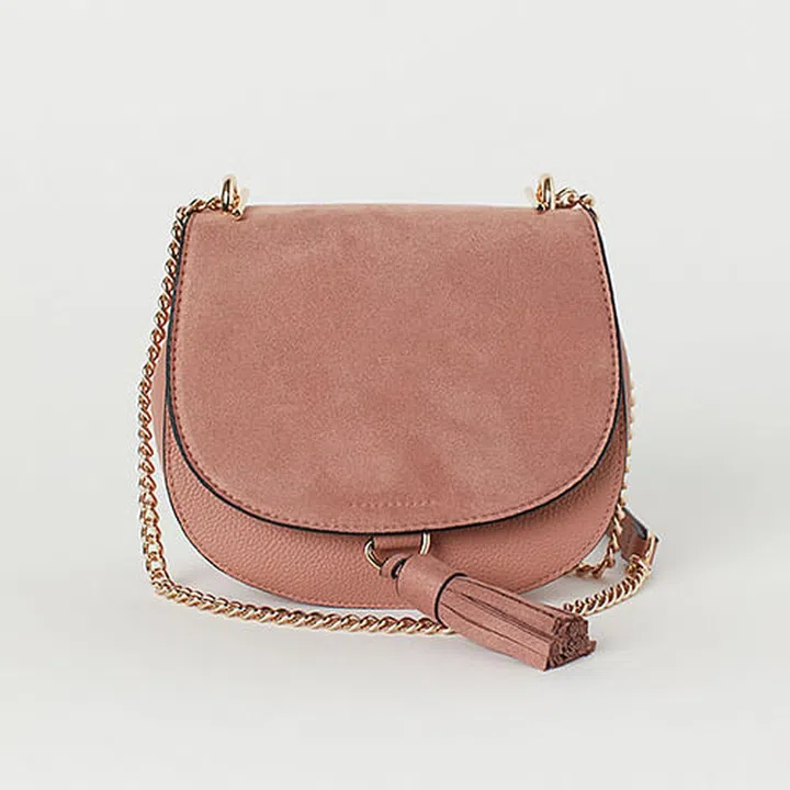 We love the delicate and feminine soft pink hue on this leather crossbody bag. Juxtapose its girly hue with a serious black pant suit.