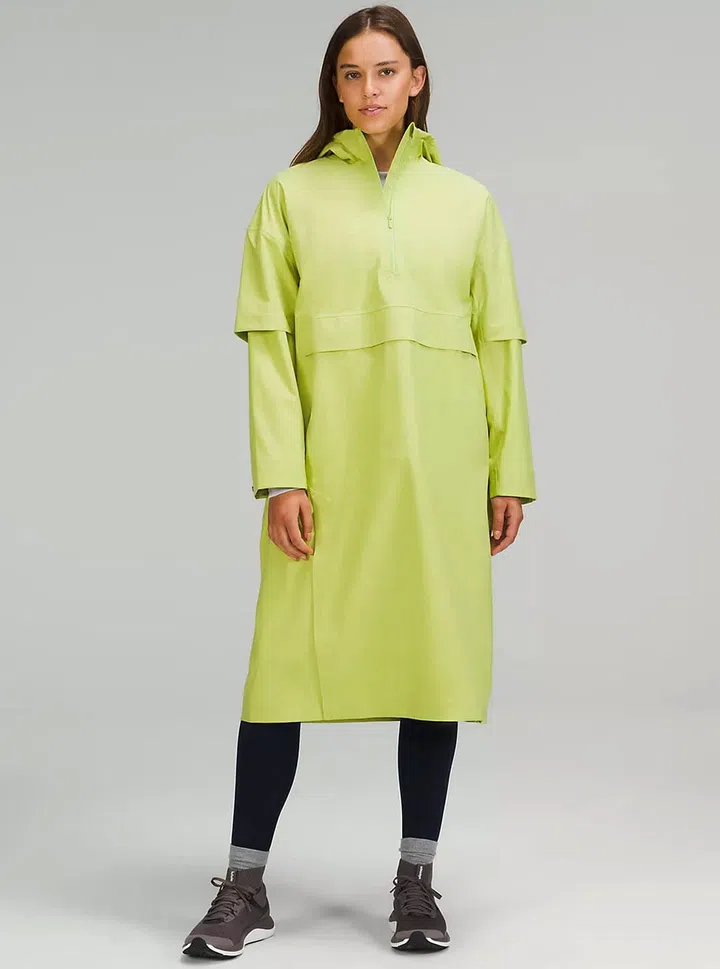 To inject some sunshine into your rainy day outfit, go for this wasabi green rain poncho from Lululemon. Built with a cinchable hood, this poncho is also available in black.