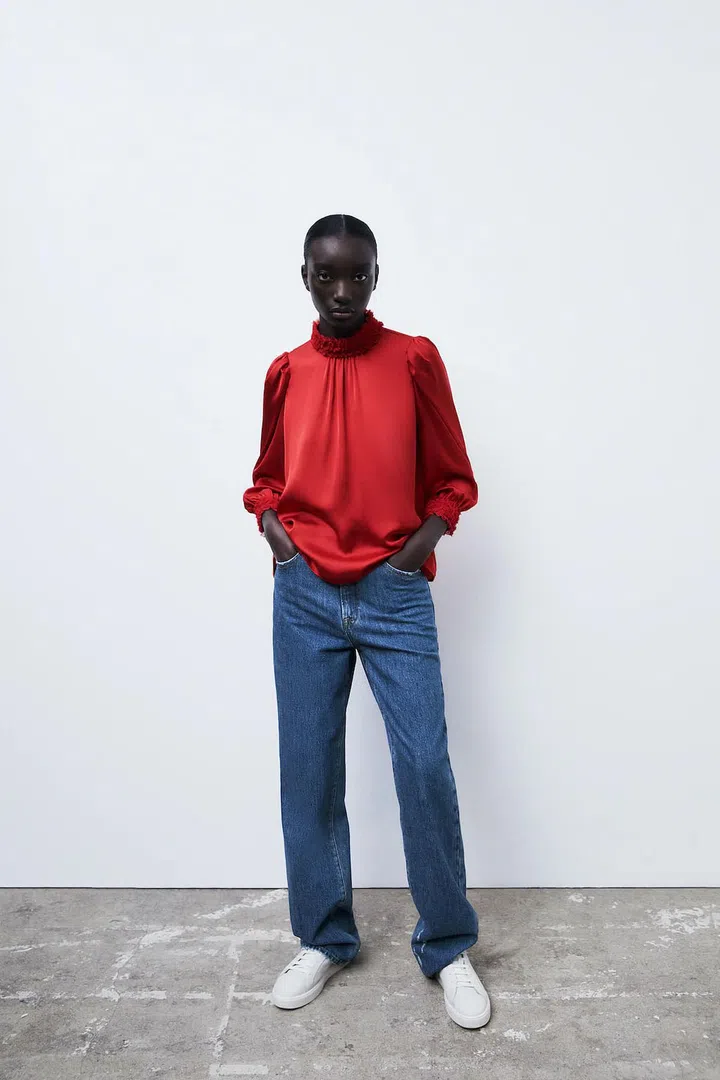 A silk or satin blouse is something you'll likely have in your wardrobe thanks to its lightweight and stylish nature. This iteration takes it a step further with ruffled trims along the collar and sleeves. Tailored pants or jeans would be best to complete the look.