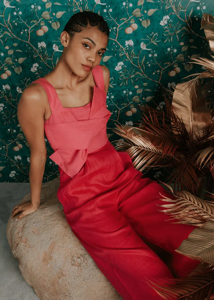 Most of you know local label The Missing Piece for their flattering dress cuts that feature unique prints. Their separates and jumpsuits, such as this colour-blocked number, continue their innovative and creative intentions. Finish with pointed heels.