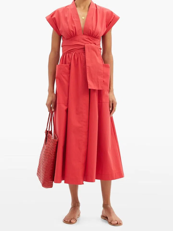 Wrap dresses are a fan favourite to cinch and fake an hourglass shape. Three Graces London made it theirs by adding turn-up cap sleeves to contrast the wide waist tie and large side patch pockets. Finish with a pair of boho sandals or Mary Jane shoes.
