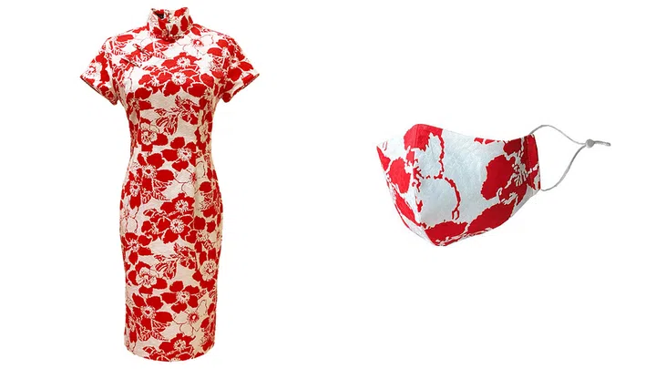 Short sleeve qi pao, $188 (UP: $208), cotton poly washable reusable face mask, $12.80 (UP: $18.80), both by Cloth.ier at Robinsons.com.sg