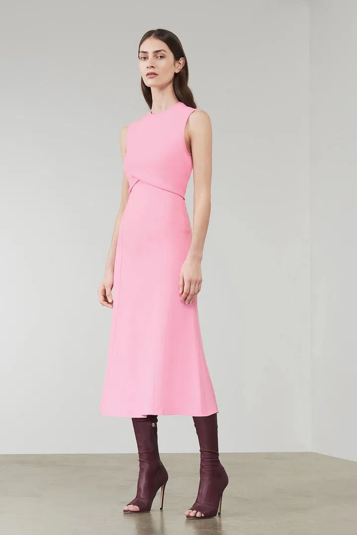 With a fit and flare shape created by the draped waist detail, this fun bubblegum pink dress is a flattering design that many body types can wear. Juxtapose the feminine vibes with chunky boots and link bracelets.