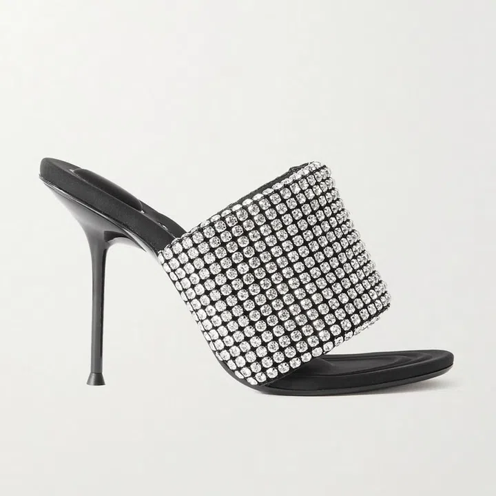 For all-out fabulousness with a super sexy slant, try on Alexander Wang’s stilettoed Sienna crystal-embellished leather mules!