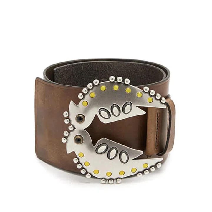 Crafted to a wide silhouette from brown leather with a vintage faded effect, Isabel Marant’s Yona belt captures the zeitgeist of the ‘70s with a statement silver-tone metal buckle shaped to look like two asymmetrical birds embellished with studs. Style yours with a dainty floral maxi dress, or team it with neutral separates and loop it through a muted green midi skirt with cowboy boots.
