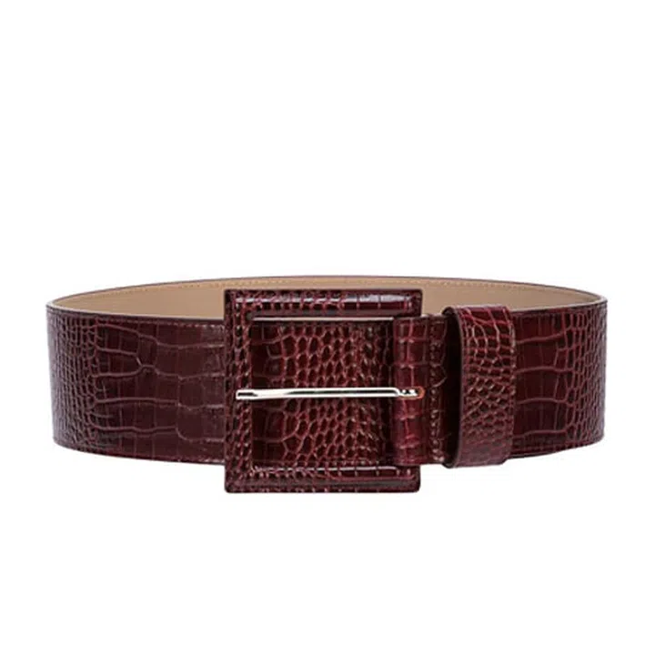 Made from embossed crocodile effect leather in a stunning burgundy shade, this retro wide belt features a square-shaped buckle. Consider styling this over a white tailored suit with a flowy black silk-satin dress and finish the look with matching croc-effect mules. For a more casual outfit, team this with a patterned puff-sleeved blouse and loop it through a high-waisted pair of khaki pants.