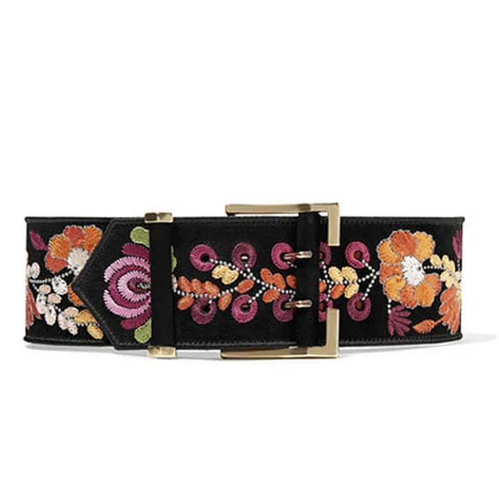 Striking and fun, this suede waist belt is embroidered with vibrant florals in bright fuschia, marigold and yellow. To add, the burnished gold-toned buckle adds a quaint vintage vibe. Anchor a printed jumpsuit or any bold tulle skirt with this number for a loud outfit that’ll make you feel confident.