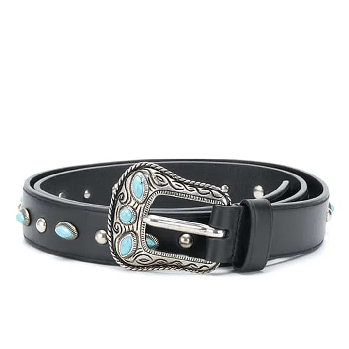 Incorporate a hint of Western dressing into your wardrobe with this belt from Prada, a slim black calf leather crafted waist belt highlighted by a silver buckle carved with intricate patterns and encrusted with turquoise and silver studs. Team this with a simple white shirt dress and a pair of ankle boots for the weekend.
