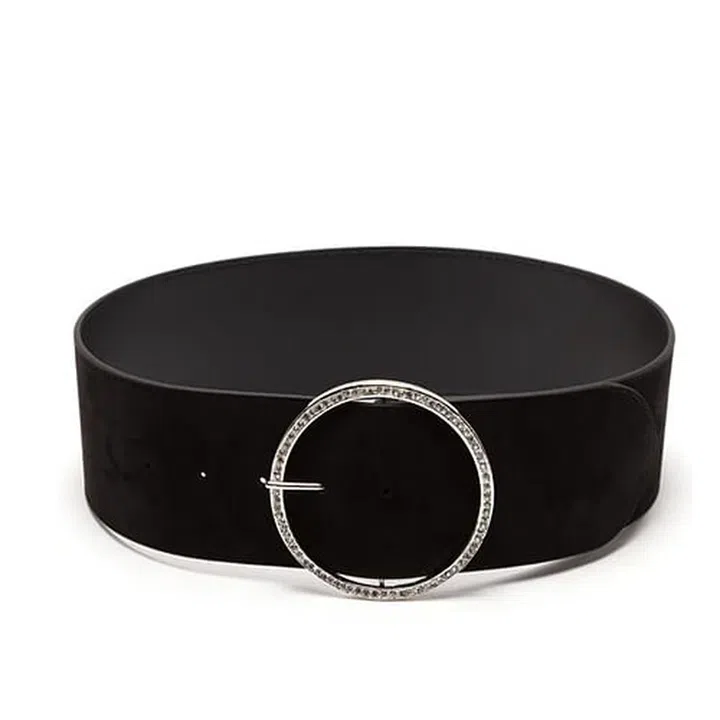 Add a touch of luxury to any look with this suede belt which features a wide strap and an oversized buckle emblazoned with tiny sparkling crystals. Suitable for more polished, elegant dresses for a formal gala, or even as an accessory for a simple tailored suit, this number will add style points to any versatile number.