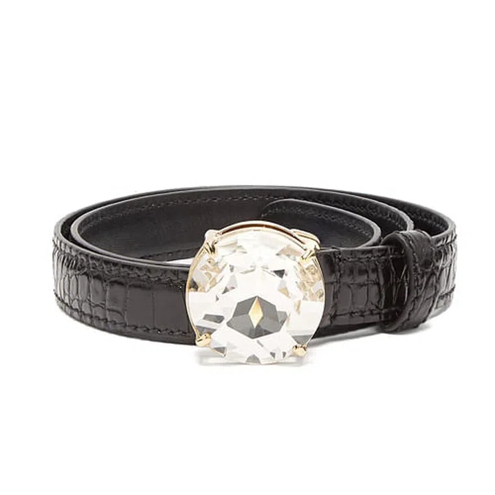 True to Miu Miu’s sweet-infused sophistication, this black leather belt showcases a delicate crystal buckle that’s subtly engraved on its reverse side with the brand’s logo. Made from croc-embossed leather and cut to a thin-strapped silhouette, this belt will look amazing next to your little black dress and a bold pair of high heels.