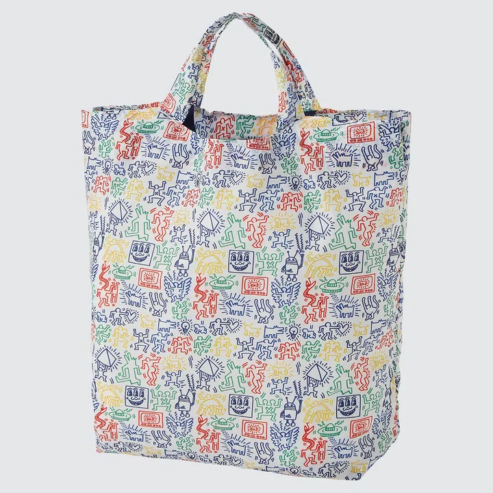 This pocketable tote features various artworks from esteemed artists Andy Warhol, Jean-Michel Basquiat and Keith Haring. We particularly love this polyester-made Keith Haring design for its colourful pattern.