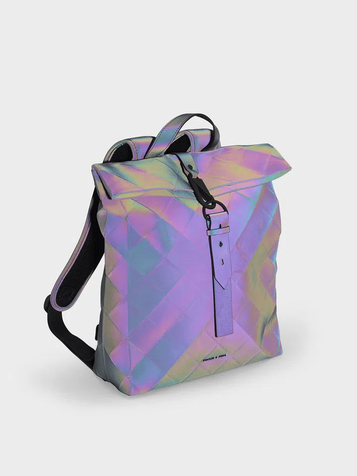 This Charles & Keith backpack checks both the style and practicality boxes. The roomy design has a cool geometric texture while the nylon fabric gives off both a duochrome (purple and green shift) and grey colour.