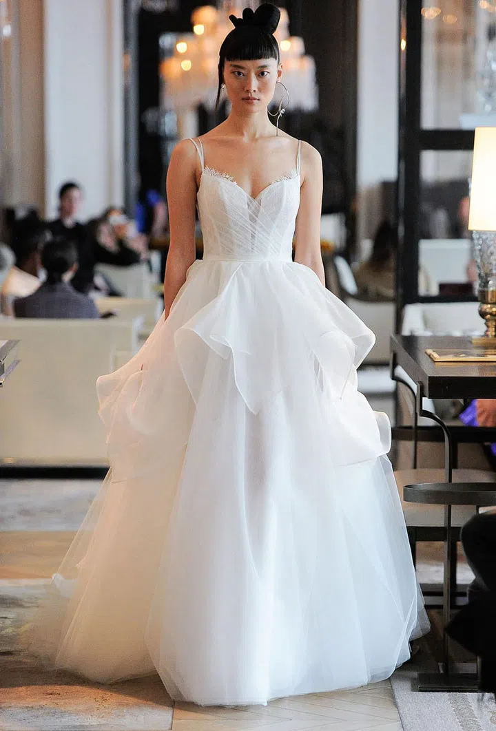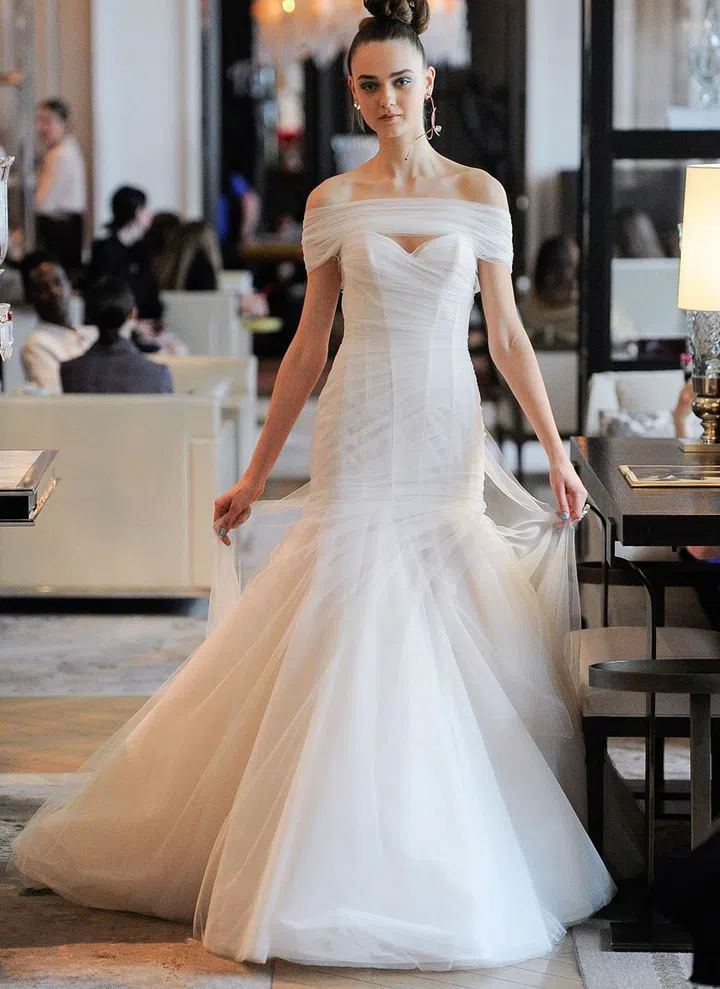 If you gravitate towards deeper necklines, consider a style like this Ines Di Santo number with strategically placed tulle gathers.